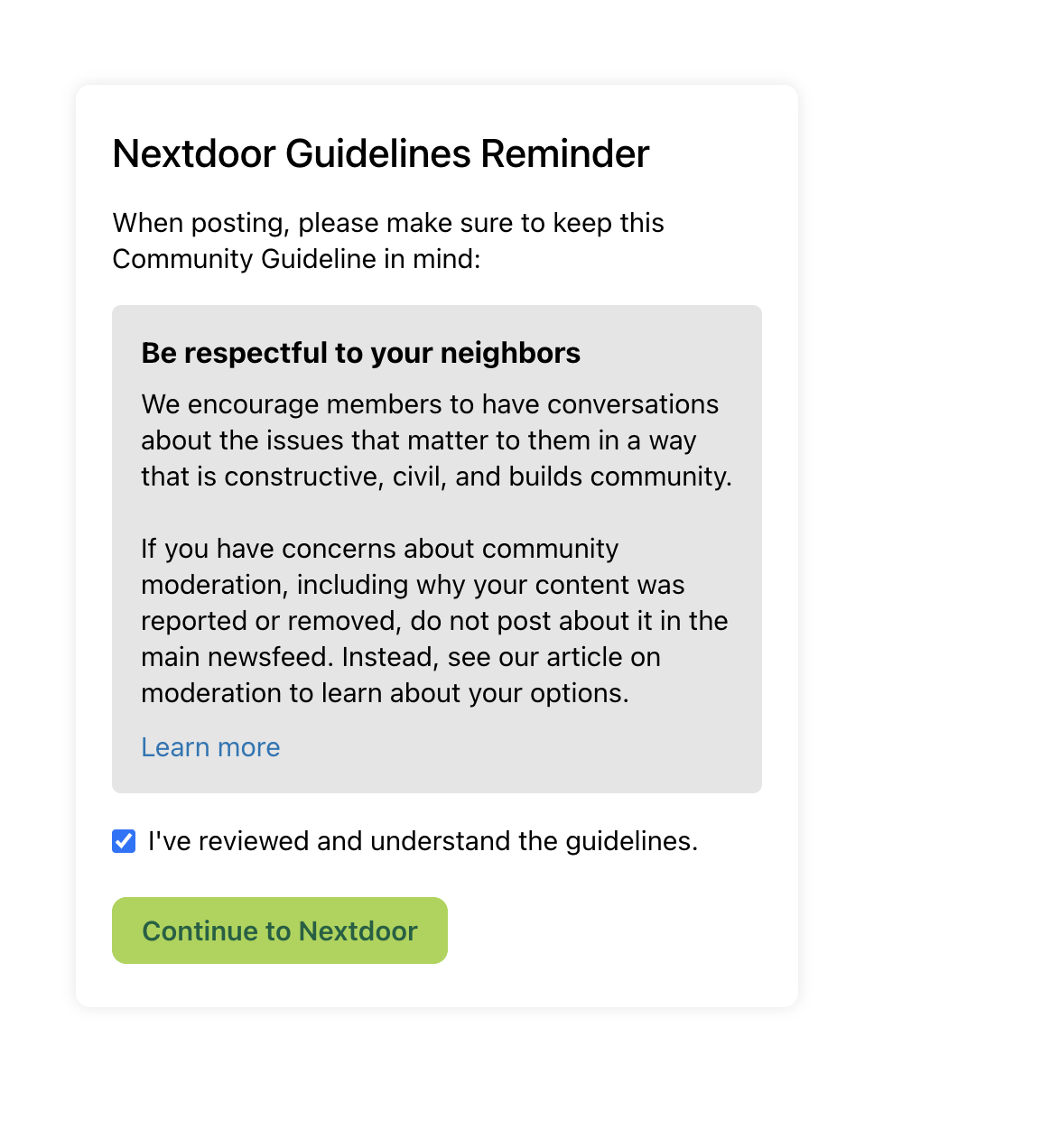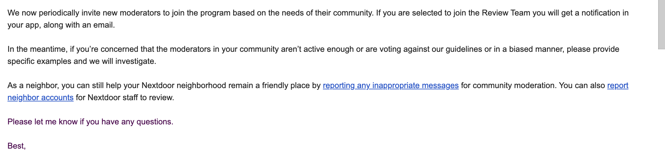 I appreciate the utility of parts of this email, but the encouragement to report community moderators is confusing. How can any Nextdoor user recognize that a community moderator isn't active or is voting in an unfair manner? I've never seen an audit trail related to moderation that would provide that level of insight, but I would be interested to see that data.