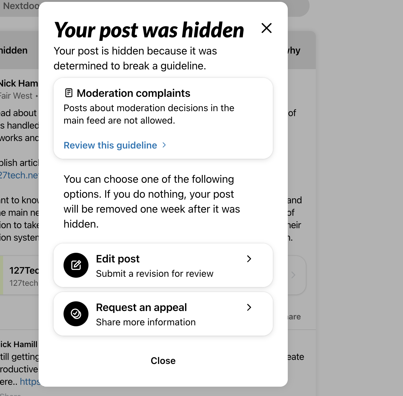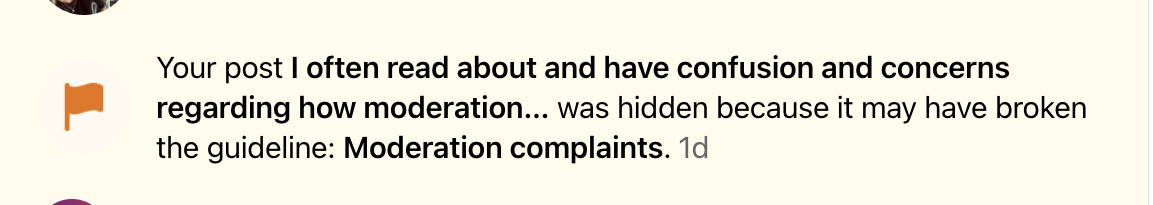 9/26: I created a nextdoor group to discuss moderation. When you create a group on Nextdoor, they site directs you to create a post for your group so I created post to describe the purpose of this group to discuss moderation on nextdoor. This post was published to the main news feed (ooops!) and, ever vigilent, Nextdoor corporate noticed. This was a mistake on my part. I didn't realize that I was posting about my group to the main news thread, but I do recognize that I did. As a result, my account was suspended for 4 days.