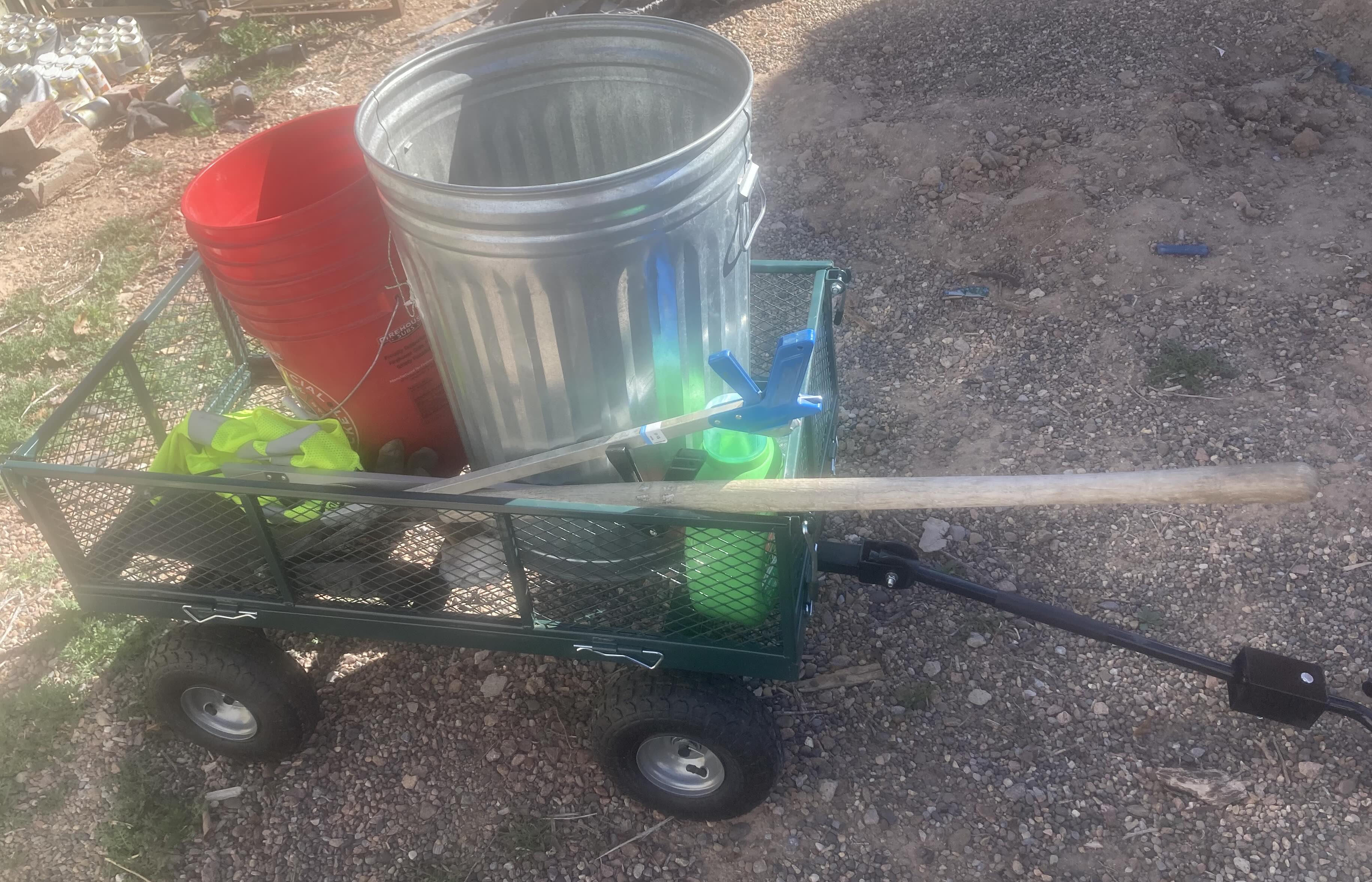 We have big plastic bags, a trash can, shovel, broom, 2 5 gallon buckets, a vest, 2 pairs of gloves, a sharps container, one can of coke and one bottle of water.